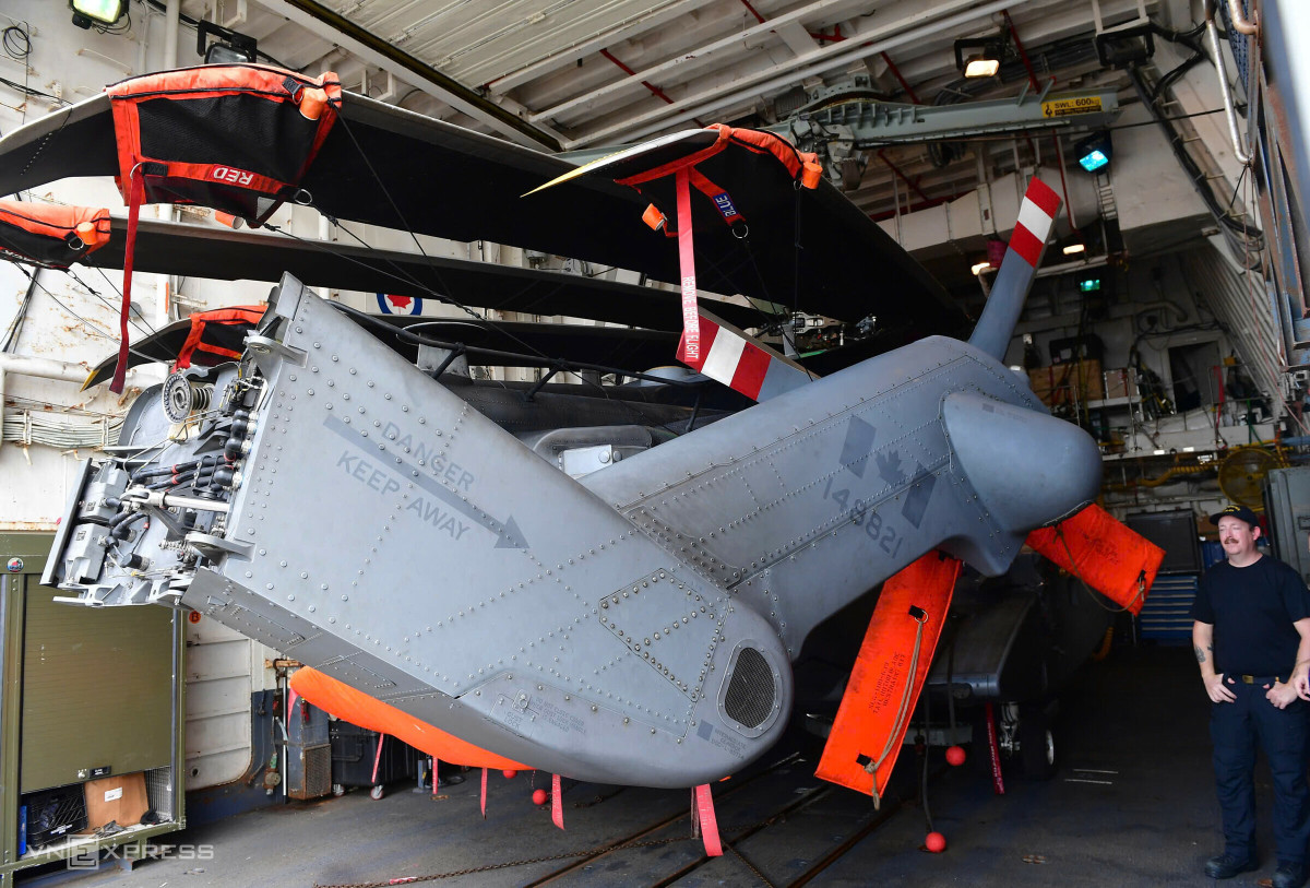 Trực thăng CH-148 Cyclone được buộc cánh, gập đuôi trong trạng thái bảo quản bên trong khoang chứa trên tàu.
